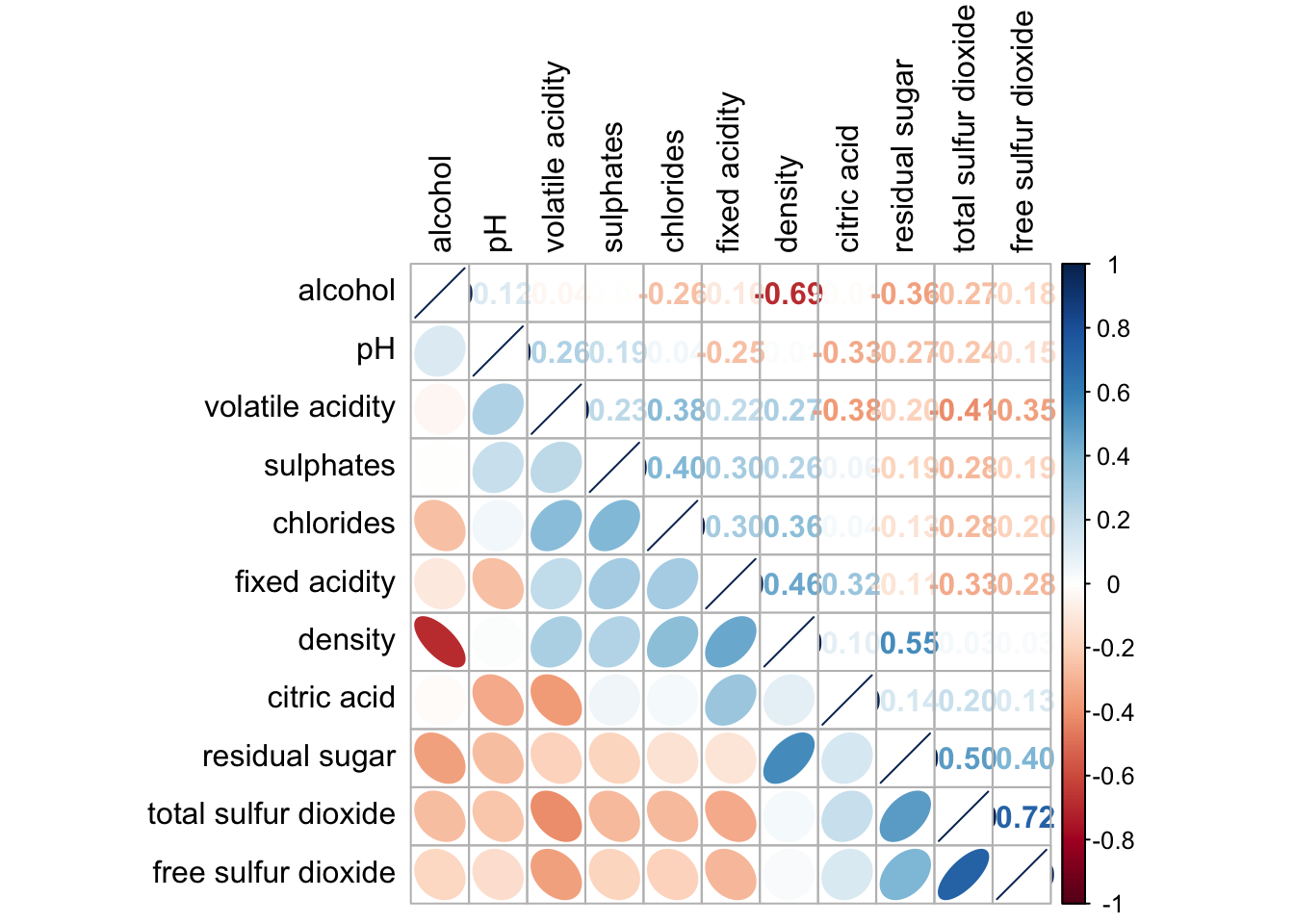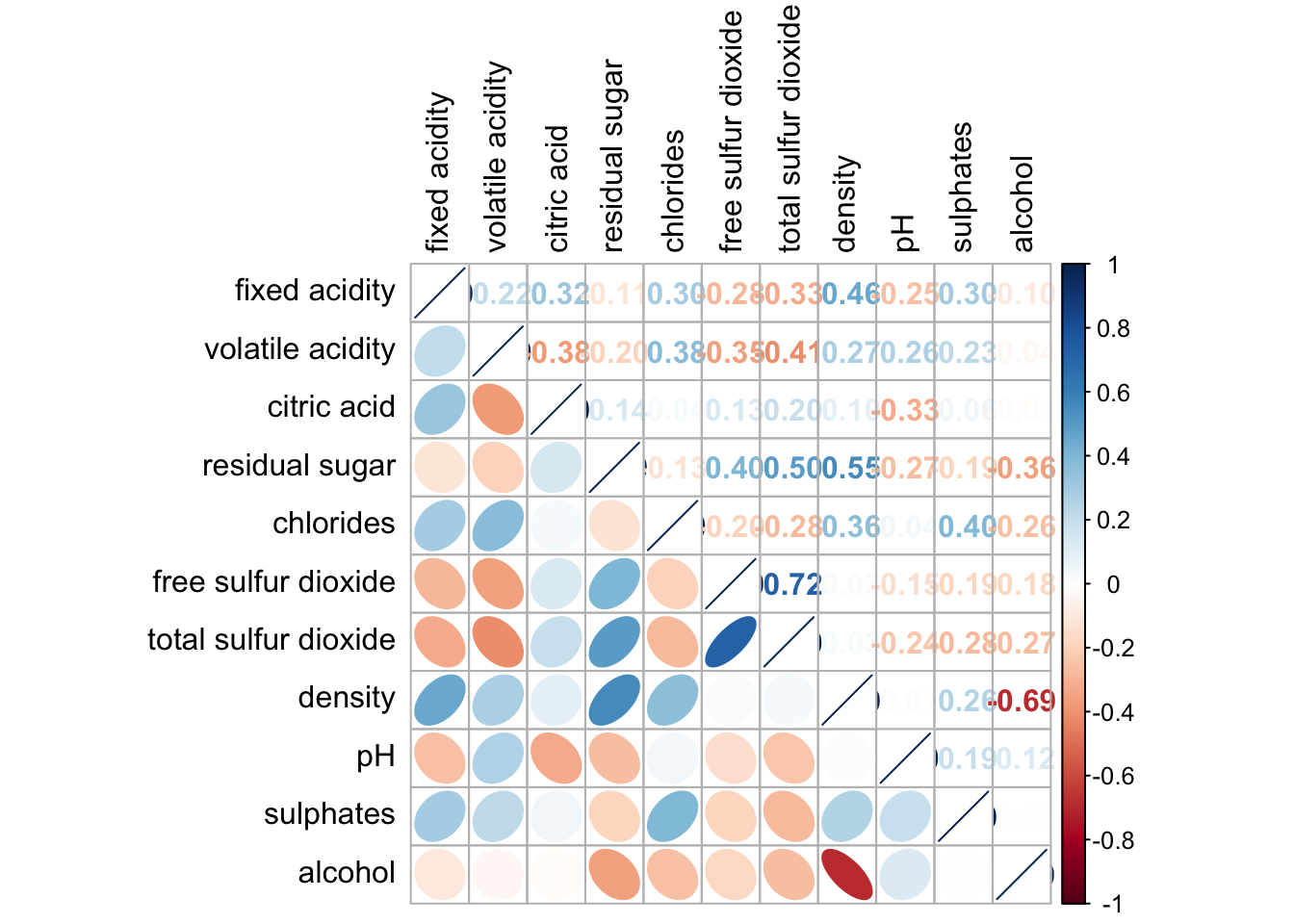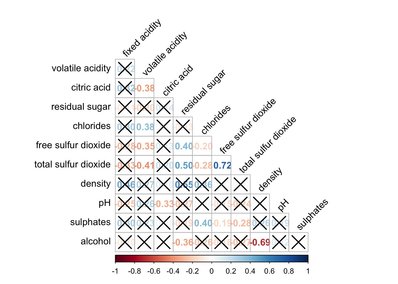 Figure below shows a corrgram combined with the significant test. The corrgram reveals that not all correlation pairs are statistically significant. For example the correlation between total sulfur dioxide and free surfur dioxide is statistically significant at significant level of 0.1 but not the pair between total sulfur dioxide and citric acid.