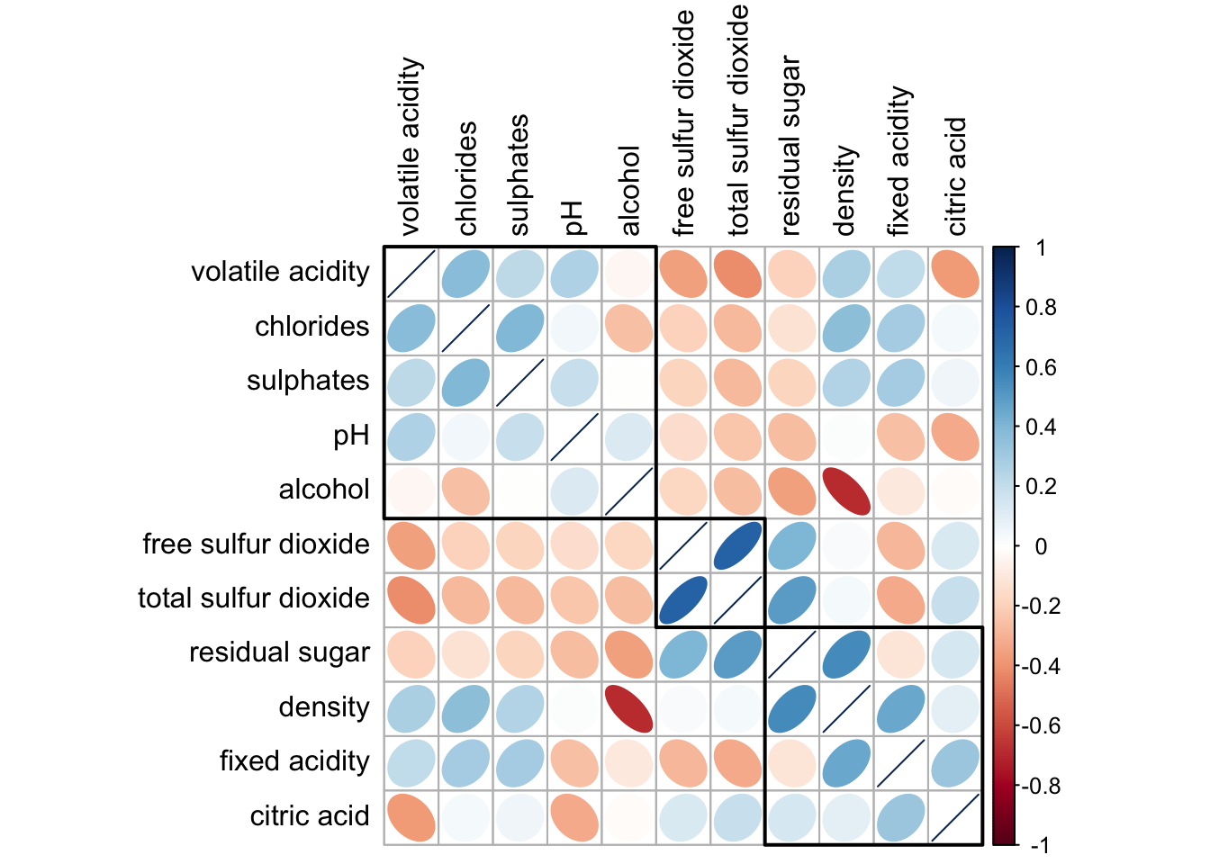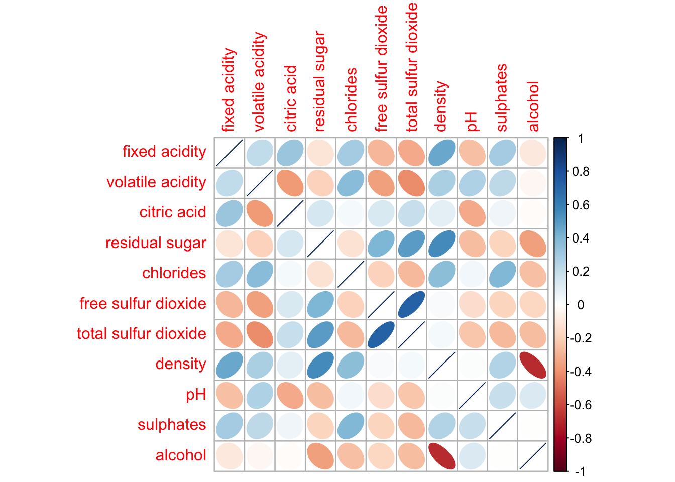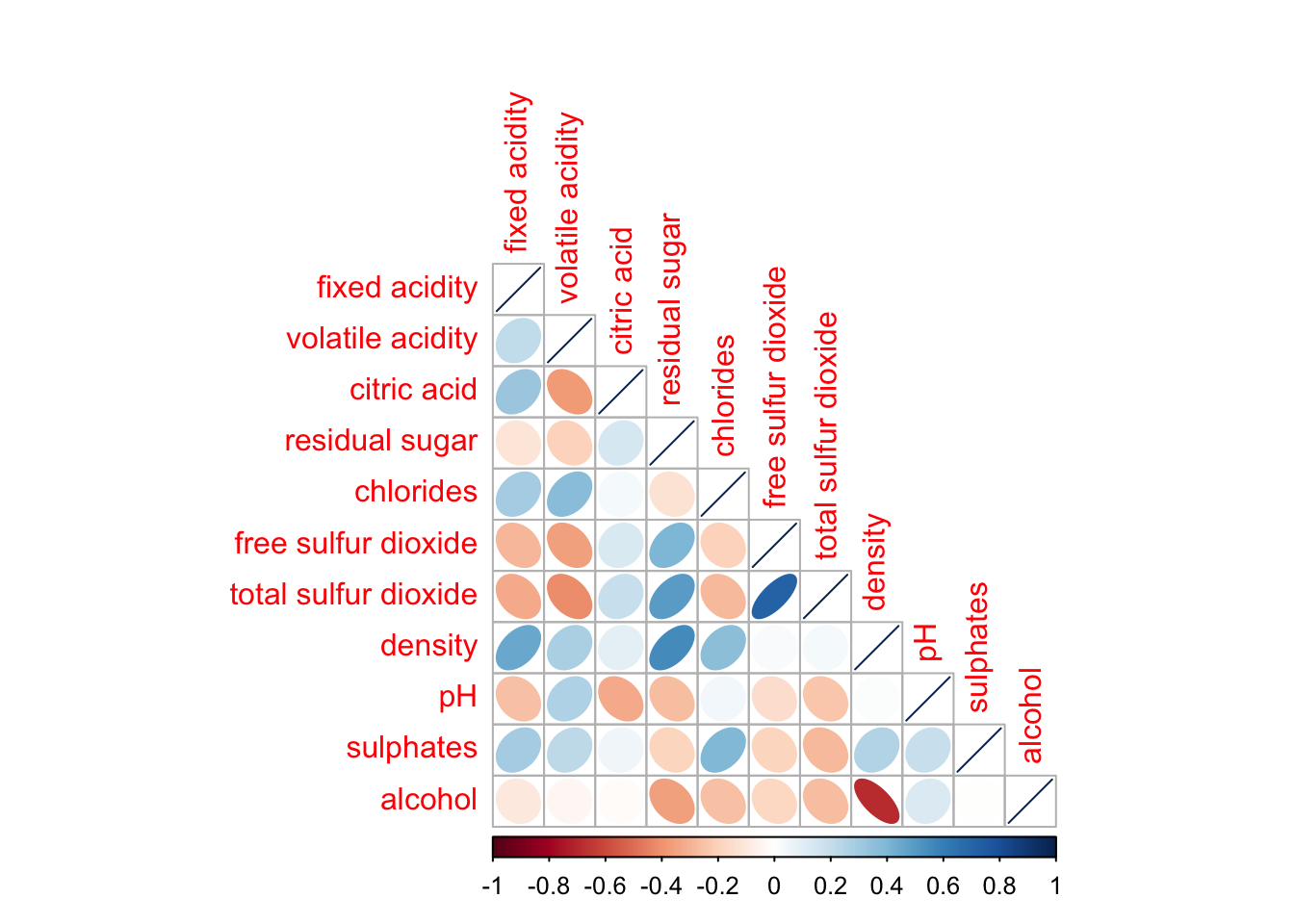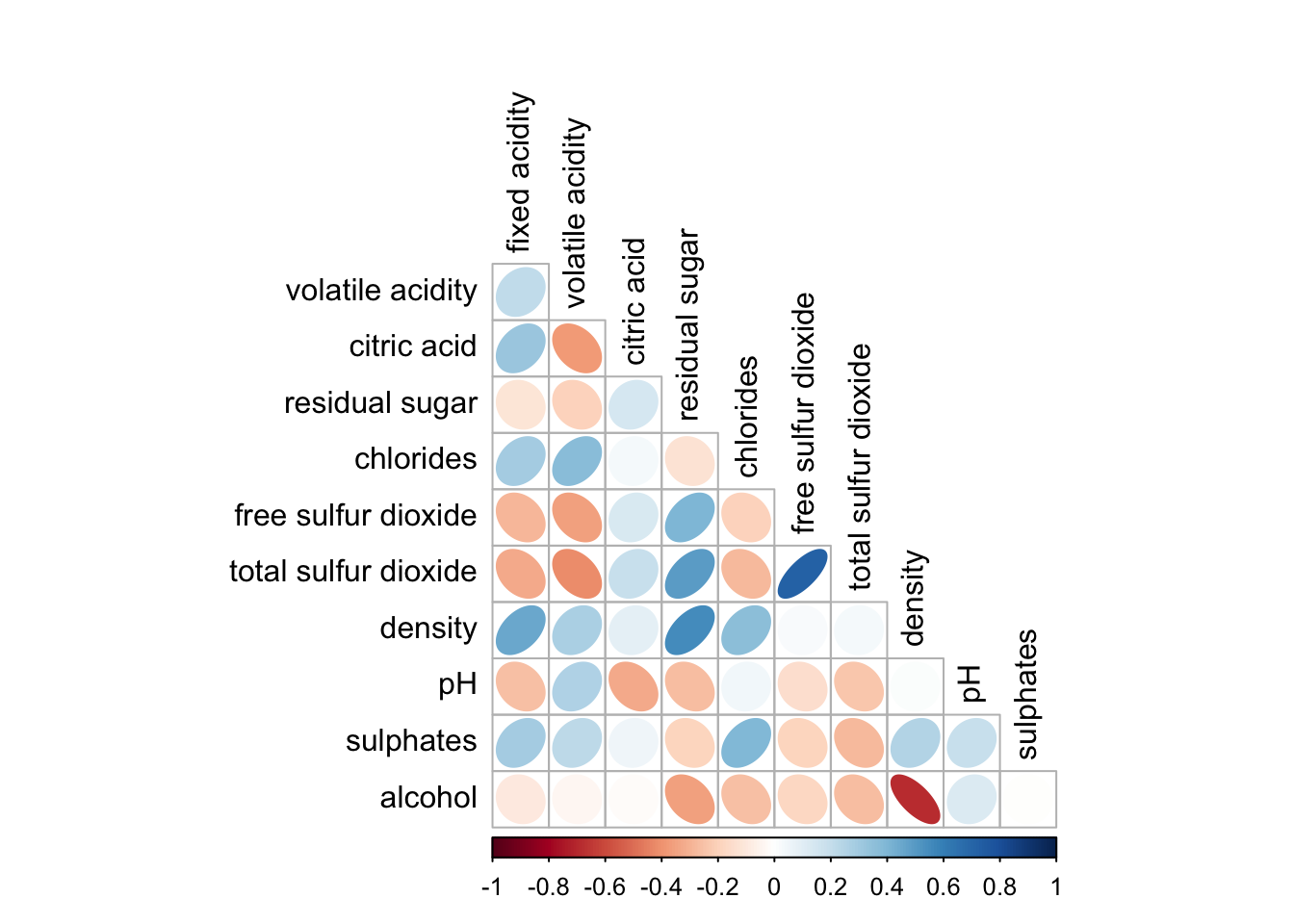 Figure below shows a corrgram combined with the significant test. The corrgram reveals that not all correlation pairs are statistically significant. For example the correlation between total sulfur dioxide and free surfur dioxide is statistically significant at significant level of 0.1 but not the pair between total sulfur dioxide and citric acid.