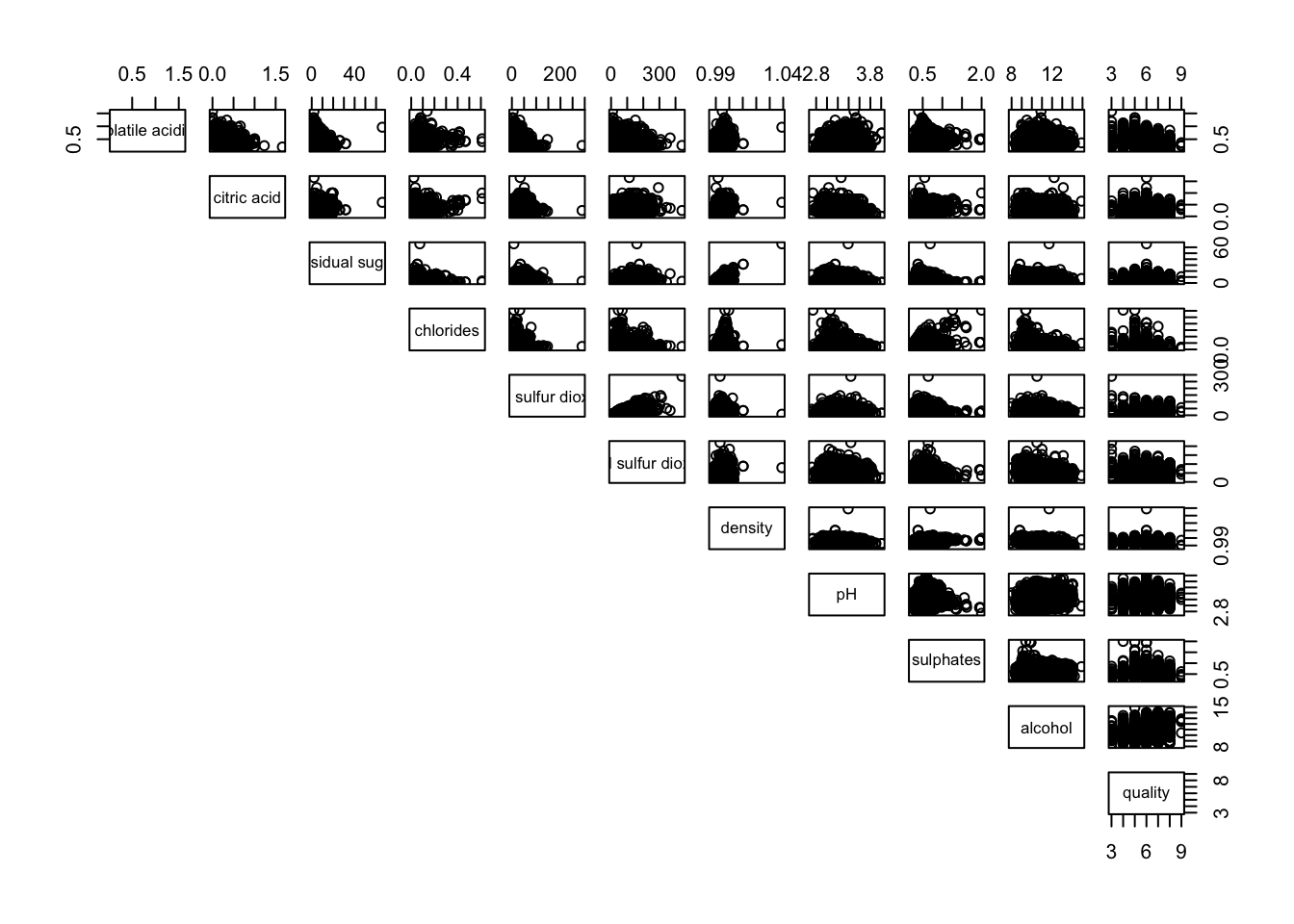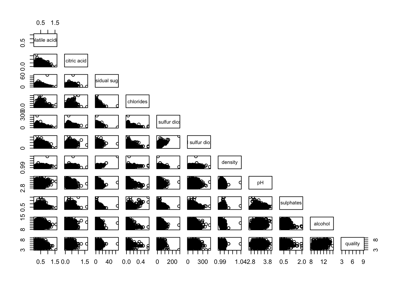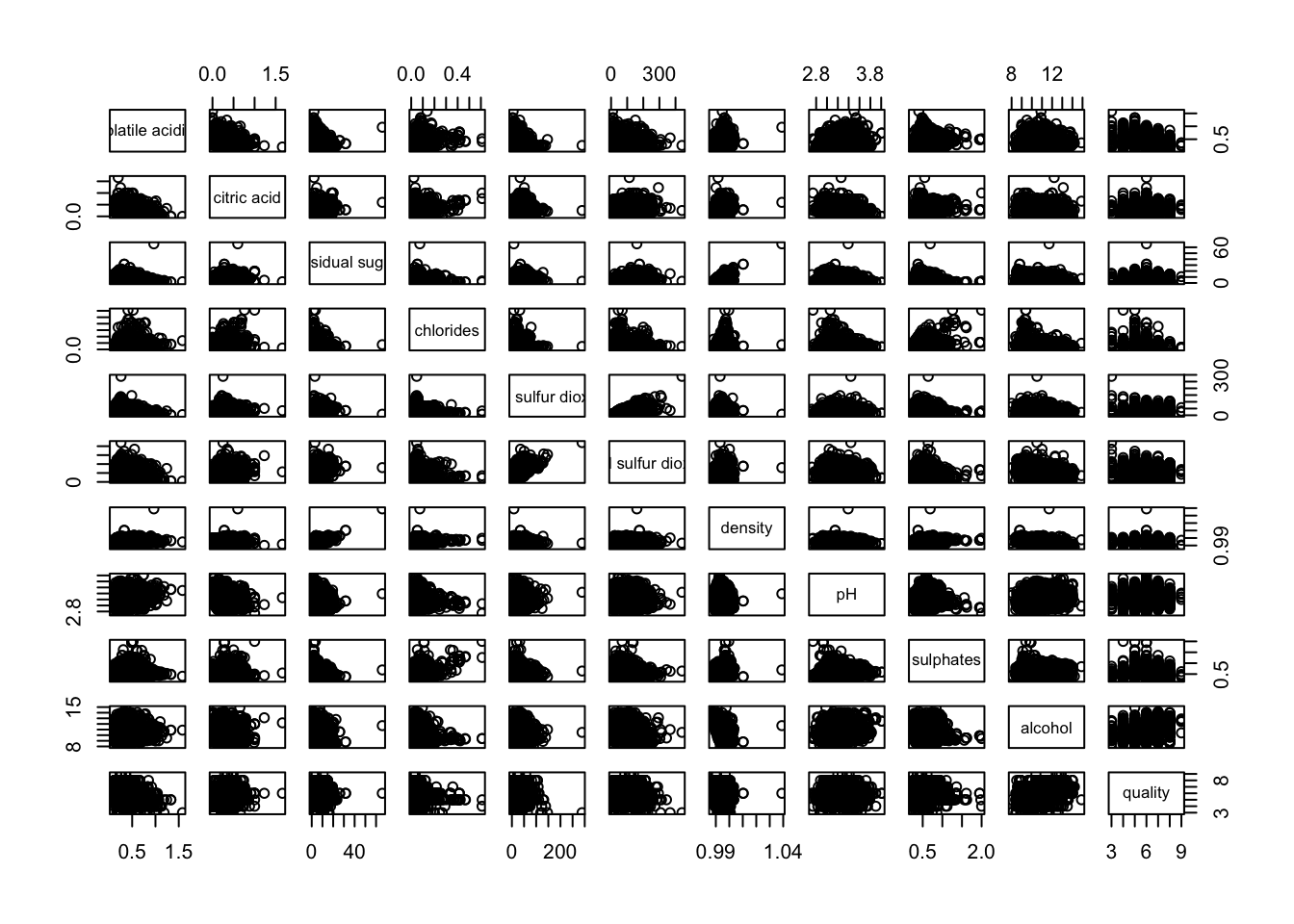Figure below shows the scatter plot matrix of Wine Quality Data. It is a 11 by 11 matrix.