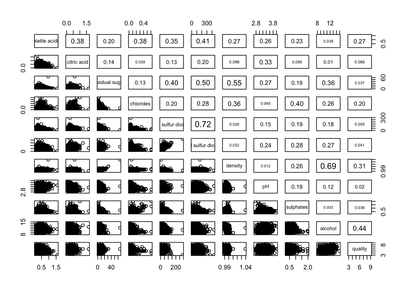 The required input of pairs() can be a matrix or data frame. The code chunk used to create the scatterplot matrix is relatively simple. It uses the default pairs function. Columns 2 to 12 of wine dataframe is used to build the scatterplot matrix. The variables are: fixed acidity, volatile acidity, citric acid, residual sugar, chlorides, free sulfur dioxide, total sulfur dioxide, density, pH, sulphates and alcohol.