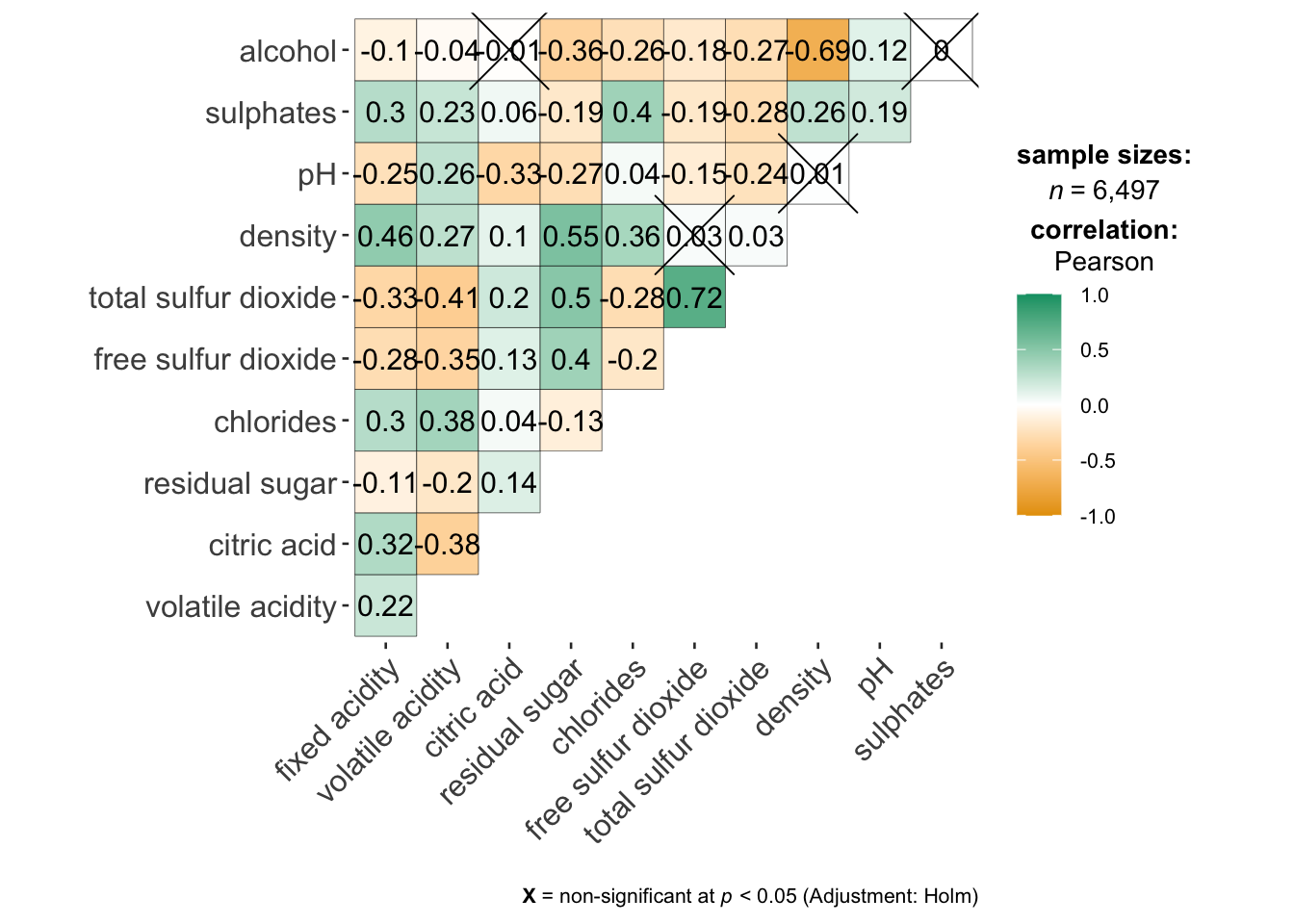 wine.sig = cor.mtest(wine.cor, conf.level= .95)We can then use the p.mat argument of corrplot function as shown in the code chunk below.