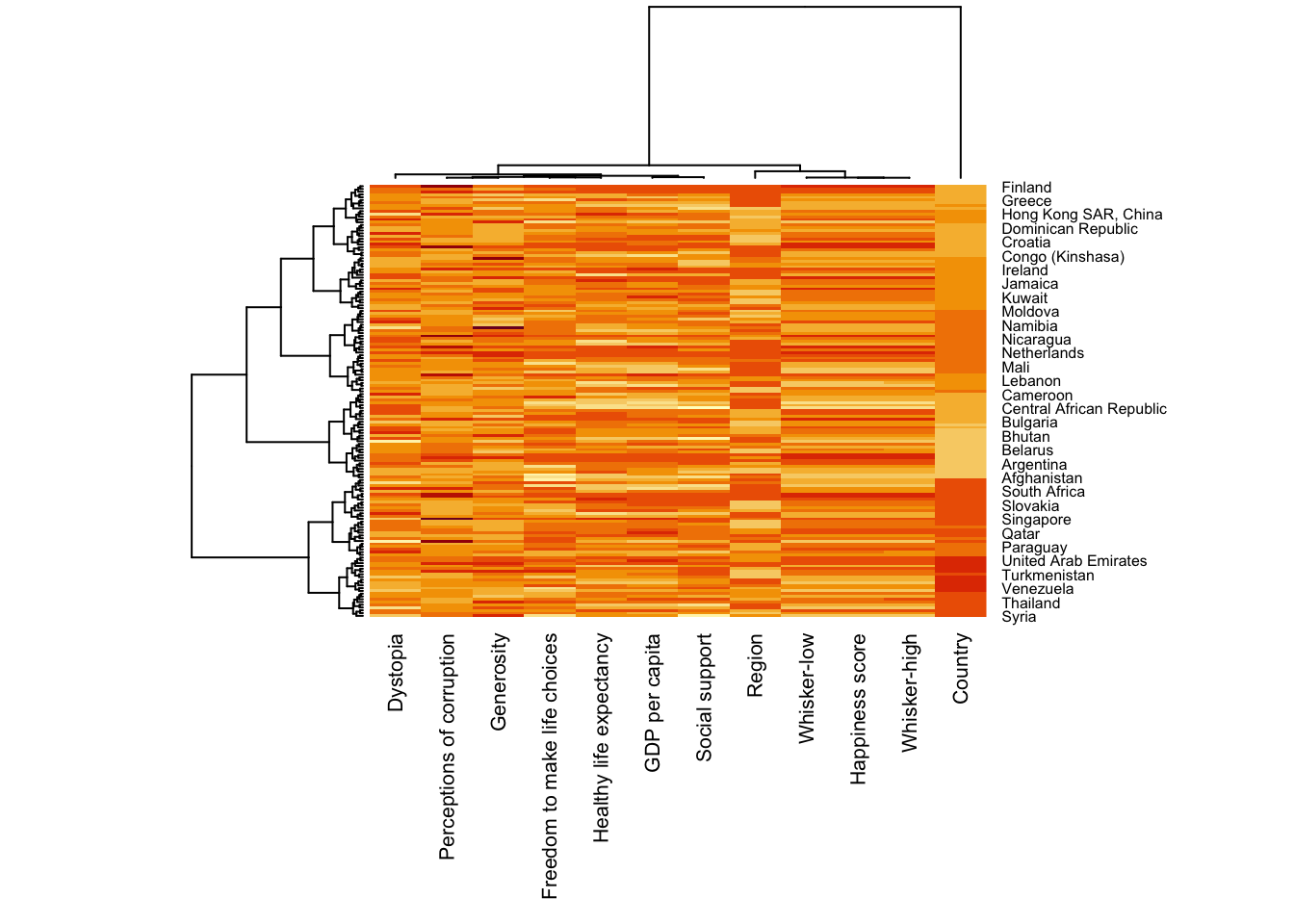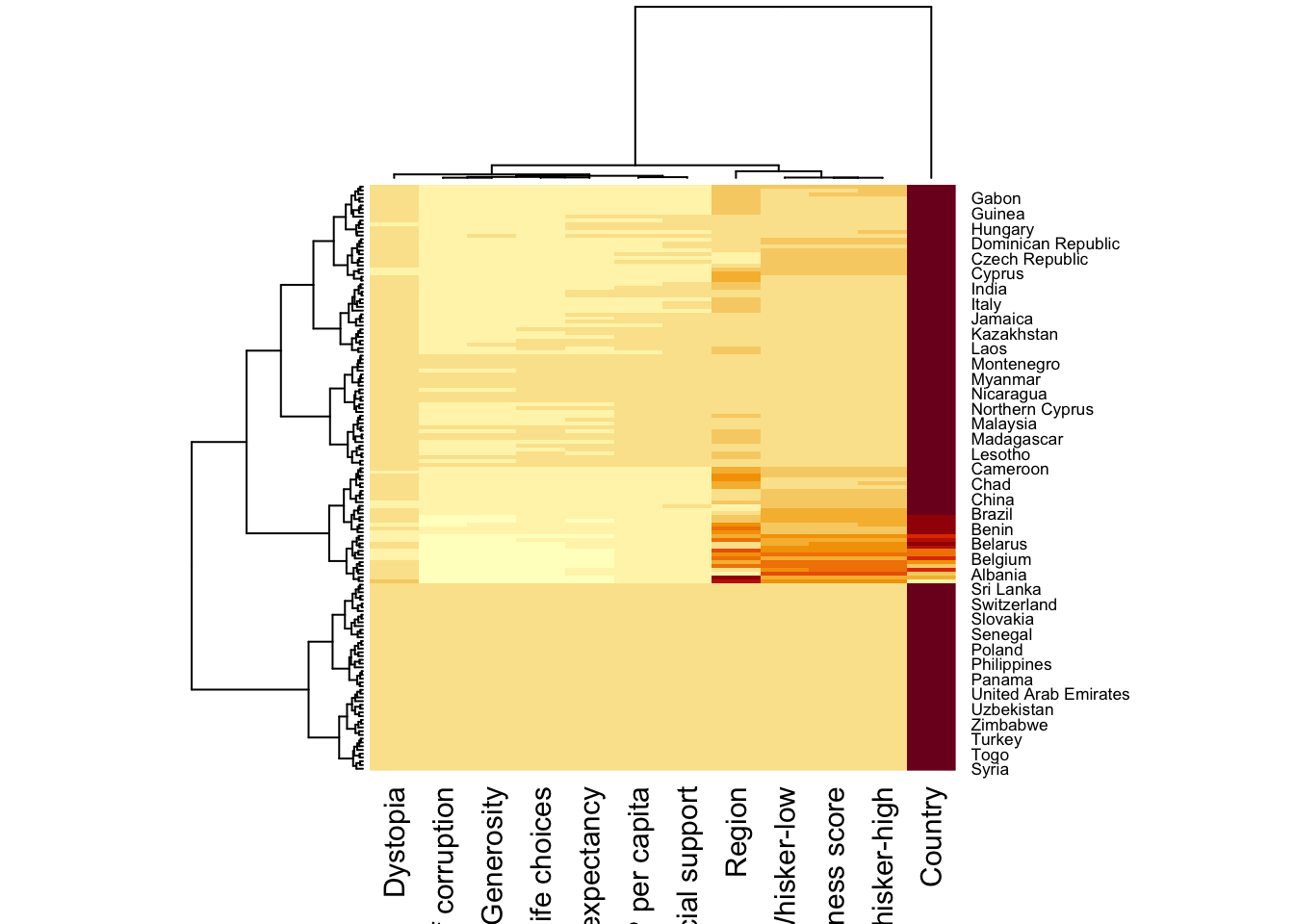 Here, red cells denotes small values, and red small ones. This heatmap is not really informative. Indeed, the Happiness Score variable have relatively higher values, what makes that the other variables with small values all look the same. Thus, we need to normalize this matrix. This is done using the scale argument. It can be applied to rows or to columns following your needs.