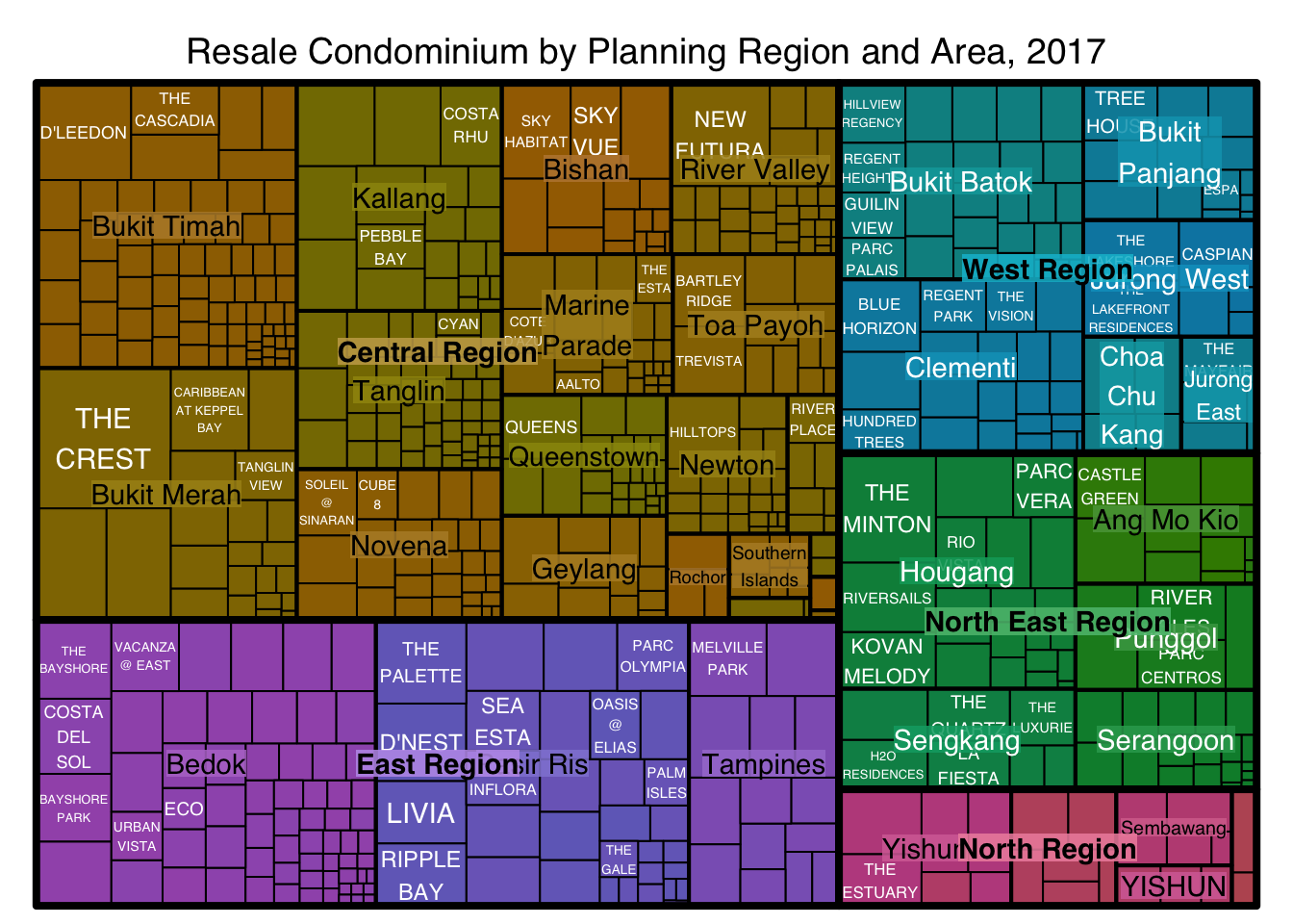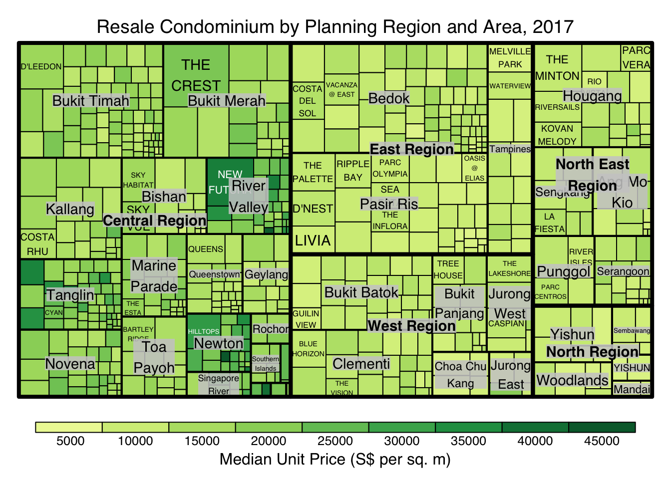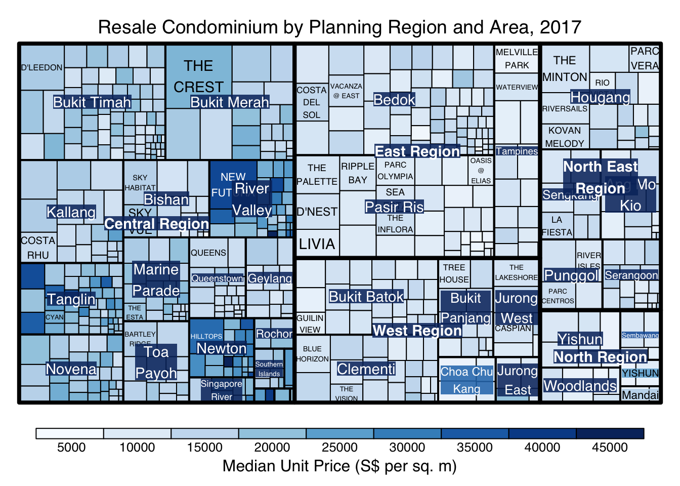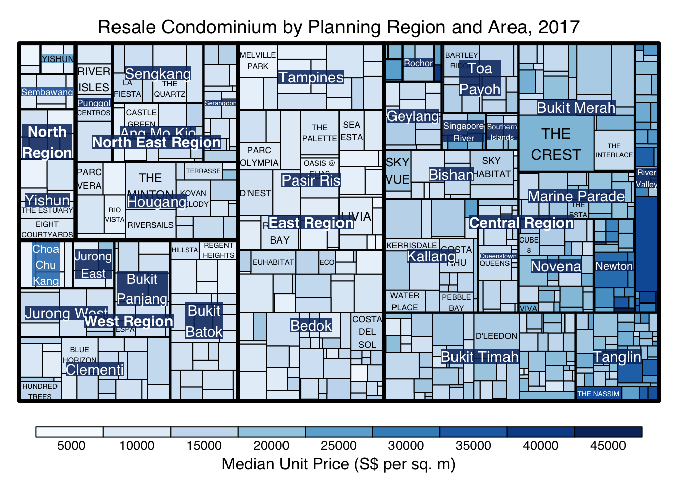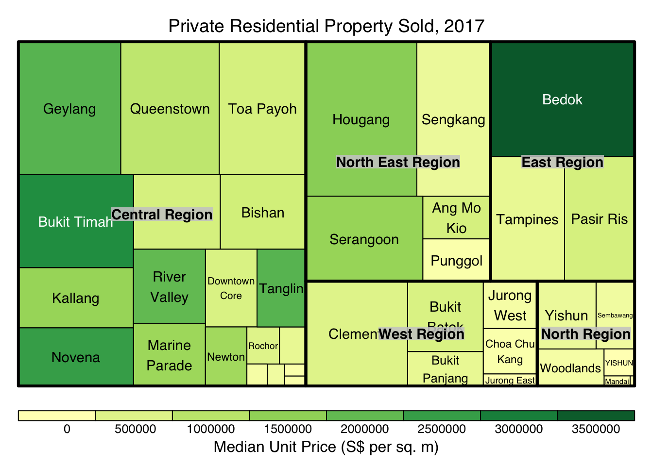 `Median Transacted Price` = median(`Transacted Price ($)`, na.rm = TRUE))16.4 Designing Treemap with treemap Package
