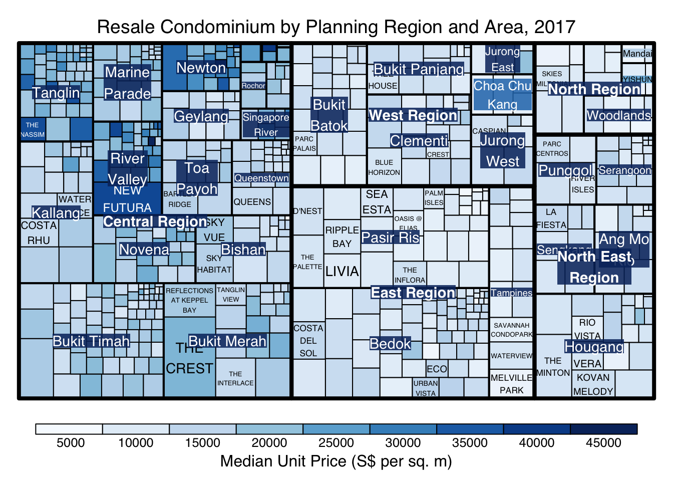 In this section, treemap() of Treemap package is used to plot a treemap showing the distribution of median unit prices and total unit sold of resale condominium by geographic hierarchy in 2017.
