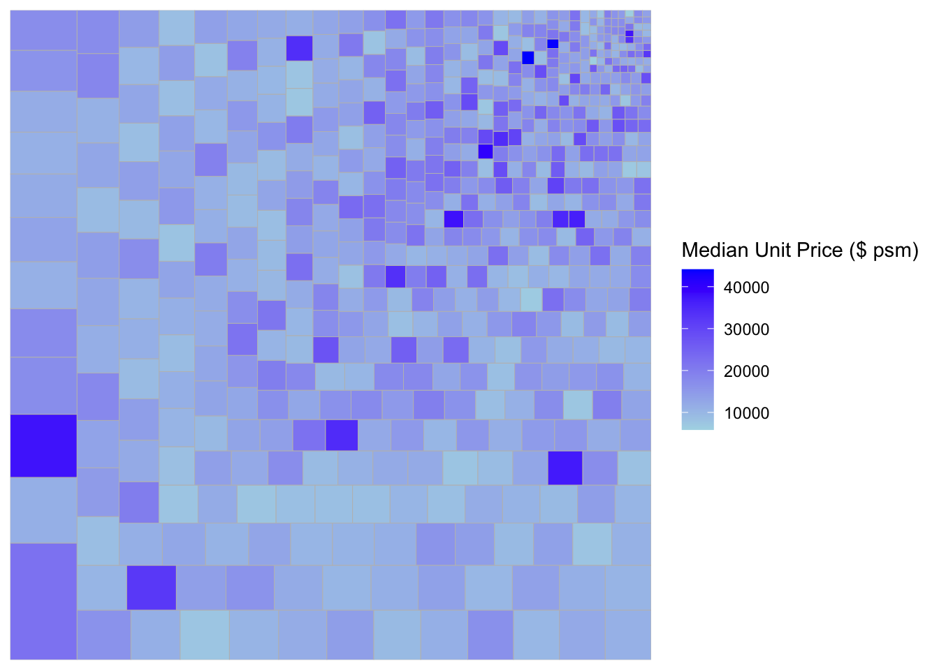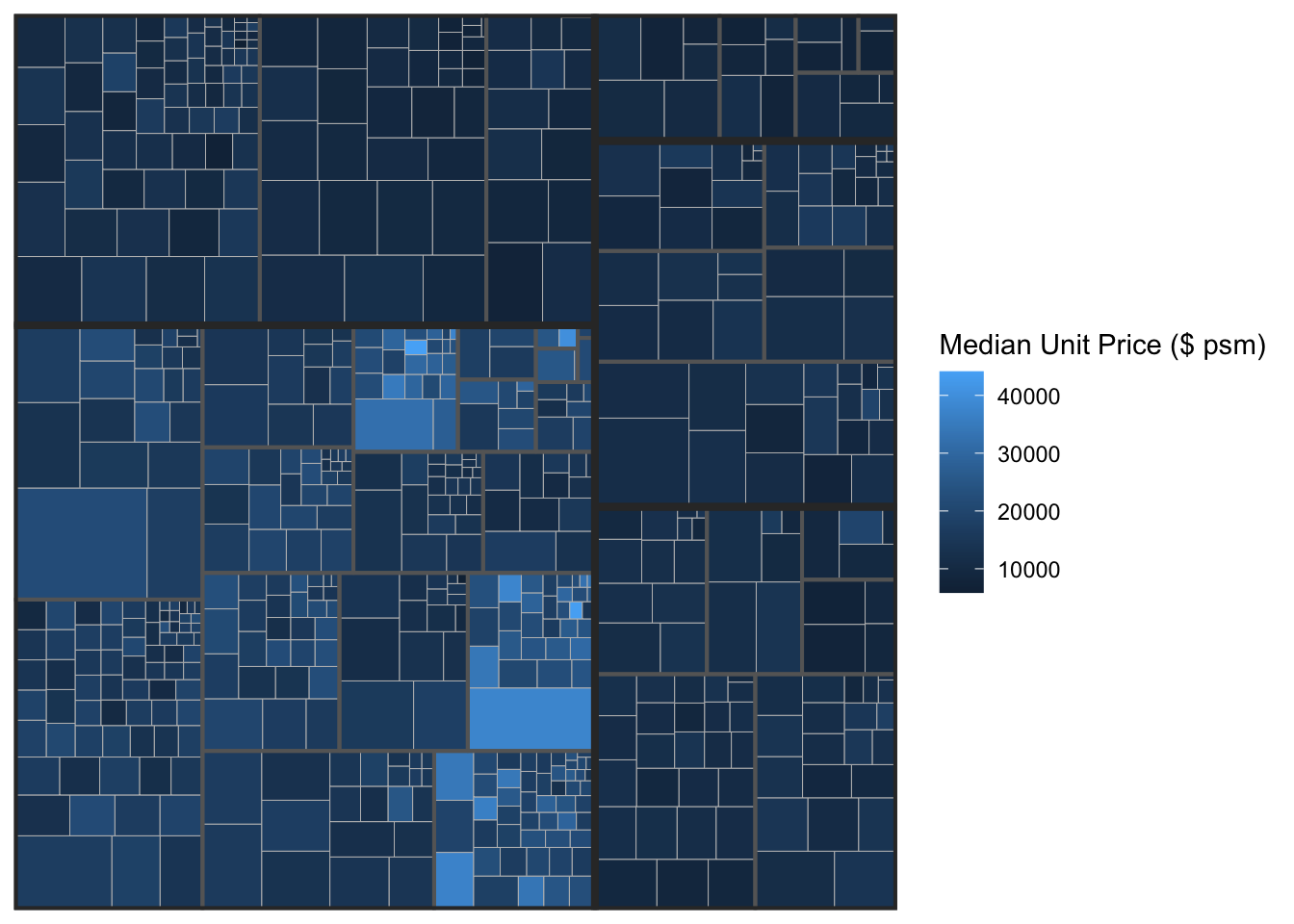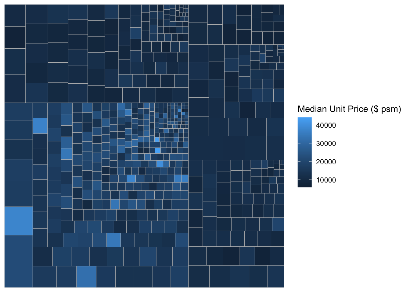The rectangles are coloured with different intensity of green, reflecting their respective median unit prices.